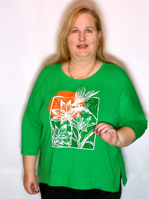 Стильный блузон выполнен из высококачественного трикотажного полотна с 95% содержанием Вискозы.