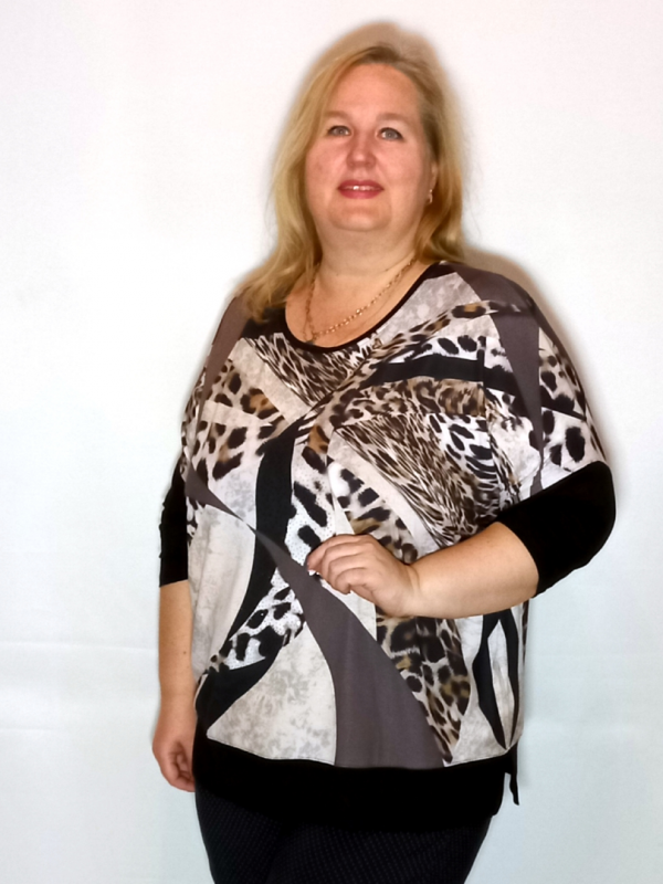 Рукав 3/4, спущенное плечо, нижняя часть из однотонного трикотажа.