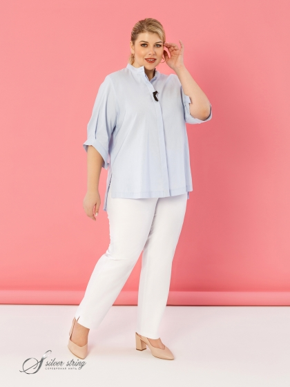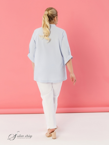 Оригинальная Блузка-рубашка в стиле «Smart-casual» изготовлена из смесовой эластичной ткани с высоким содержанием хлопка. Модель с супатной застежкой на пуговицы и воротником-стойкой. Рукав втачной, длиной до локтя. По низу рукава заложена широкая бантовая складка и притачена манжета без застежки, что придает изделию легкую небрежность. Дополняет образ декоративная булавка в виде мужского галстука. Изделие с асимметричной линией низа: спинка удлинена относительно полочки. В боковых швах обработаны разрезы. Такой крой отлично маскирует проблемные зоны и стройнит фигуру. Непринуждённость и удобство модели сочетается со сдержанностью делового стиля, поэтому Блузка, безусловно, станет базовой вещью в Вашем гардеробе.