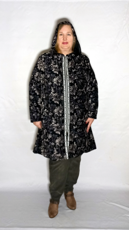 Стильный кардиган-ветровка выполнен из шанель-велюр полотна с интересным принтом. Для отделки использовали тесьму с надписями.