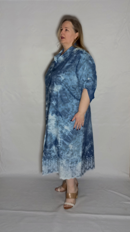 Шикарное   платье из  облегченной, рубашечной джинсы с эффектом "варенки"  и вышивкой по низу платья и рукавов.