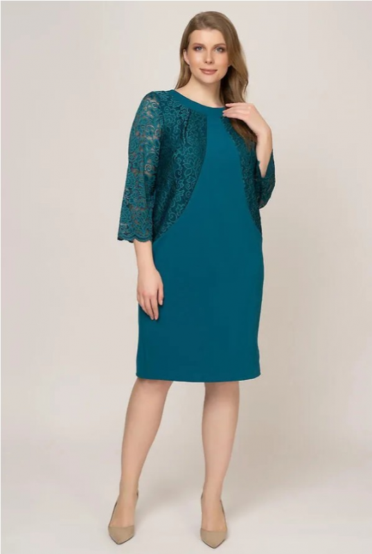Эффектное платье, выполненное в комбинации плотного трикотажа и ажурного гипюра. Модель длиной до колен, чуть заужена книзу. С круглым вырезом горловины. Крой и игра фактур имитируют кружевное болеро с втачным рукавом 3/4.
