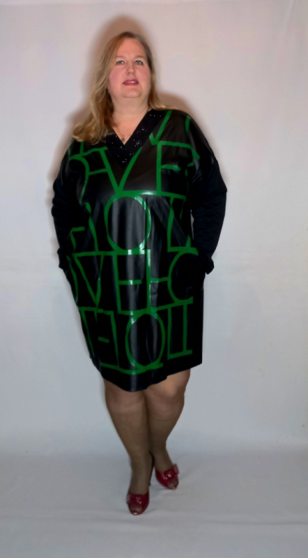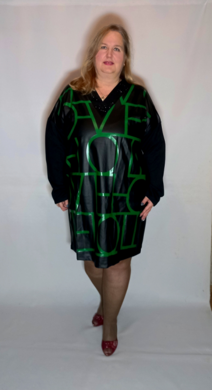 СТильное платье-туника выполнено из сочетания гладкого плотного трикотажа ( спинка и рукав) и трикотаж по д кожу. Однотонный трикотаж умеренно эластинчый, хорошо скрывает шероховатости фигуры. Трикотаж под кожу тянется слабее, но тянется